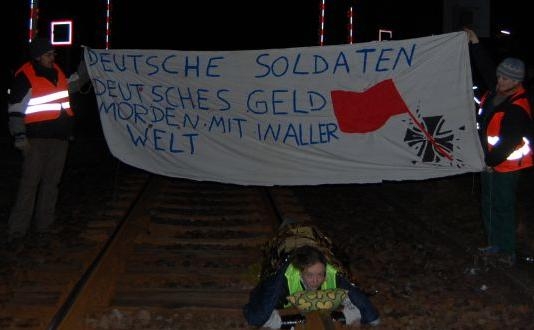 Das dies gelungen sei, zeige das starke Presseecho um die Aktion ( z.B.[http://www.shz.de/index.php?id=160&tx_ttnews[tt_news]=507432&no_cache=1](http://www.shz.de/index.php?id=160&tx_ttnews[tt_news]=507432&no_cache=1)) und die anschließenden Prozesse. „Militärzüge stoppen, um auf deutsche Kriegsbeteiligungen aufmerksam zu machen, ist in dieser Republik verboten“ kommentierte dies der Referent. Und so wurde die als „Haupttäterin“ konstruierte Person bereits zu 90 Tagessätzen a 15 Euro verurteilt. Die Betroffene hat beschlossen, diese Strafe zumindest zum Teil abzusitzen. Dabei machte der Referent deutlich, das diese Privilegierte Wahlmöglichkeit bei weitem nicht selbstverständlich sei. Viele Leute würden zum einen direkt zu Haftstrafen verurteilt, und ein weiterer noch viel größerer teil habe weder die finanziellen Mittel, noch die Vernetzung, um die haftvermeidene Geldstrafe zu bezahlen.