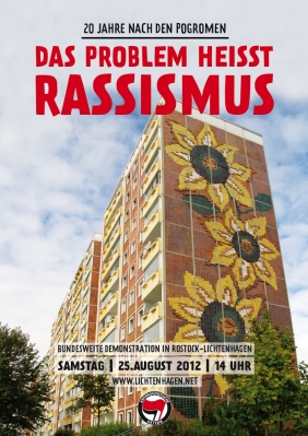 Um diese Ereignisse nicht vergessen zu lassen und um auf den rassistischen Normalzustand hinzuweisen findet am 25. August 2012 eine bundesweite Demonstration in Gedenken an die Pogrome von Rostock-Lichtenhagen statt. Verschiedene Zusammenhänge mobilisieren zu dieser unter dem Motto “20 Jahre nach den Pogromen - Das Problem heißt Rassismus” beworbenen Demo.