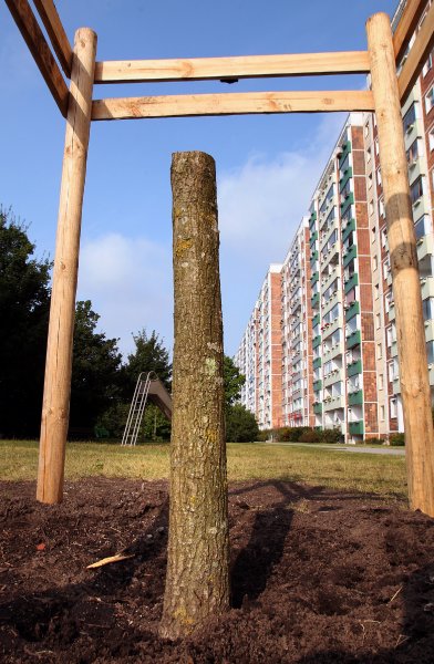 Rostock - Sie sollte ein Zeichen der Hoffnung sein: Die neugepflanzte Friedenseiche vor dem Sonnenblumenhaus in Rostock-Lichtenhagen. Doch in der Nacht zum Mittwoch sägten Unbekannte den Baum ab.