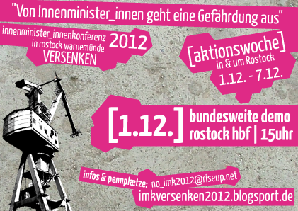 Vom 5. bis zum 7.12.2012 tagen in Rostock die Innenminister_innen der Bundesländer und der Bundesinnenminister. Sie sind unmittelbare Entscheidungsträger_innen der deutschen Asyl- und Migrationspolitik, sie sind unter anderem verantwortlich für menschenrechtswidrige Abschiebungen, Zwangsunterbringung in Lagern und Residenzpflicht.