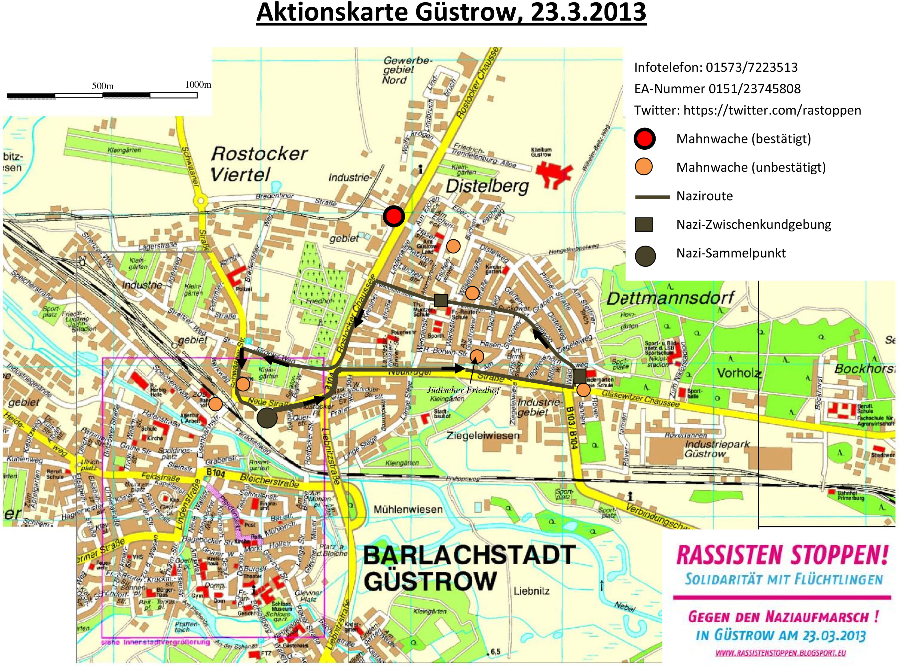 Informiert euch auf Twitter unter den Hashtags #nazismv #güstrow #rastoppen oder unter der Telefonnummer 015737223513. Die Nummer des EA lautet: 015123745808.