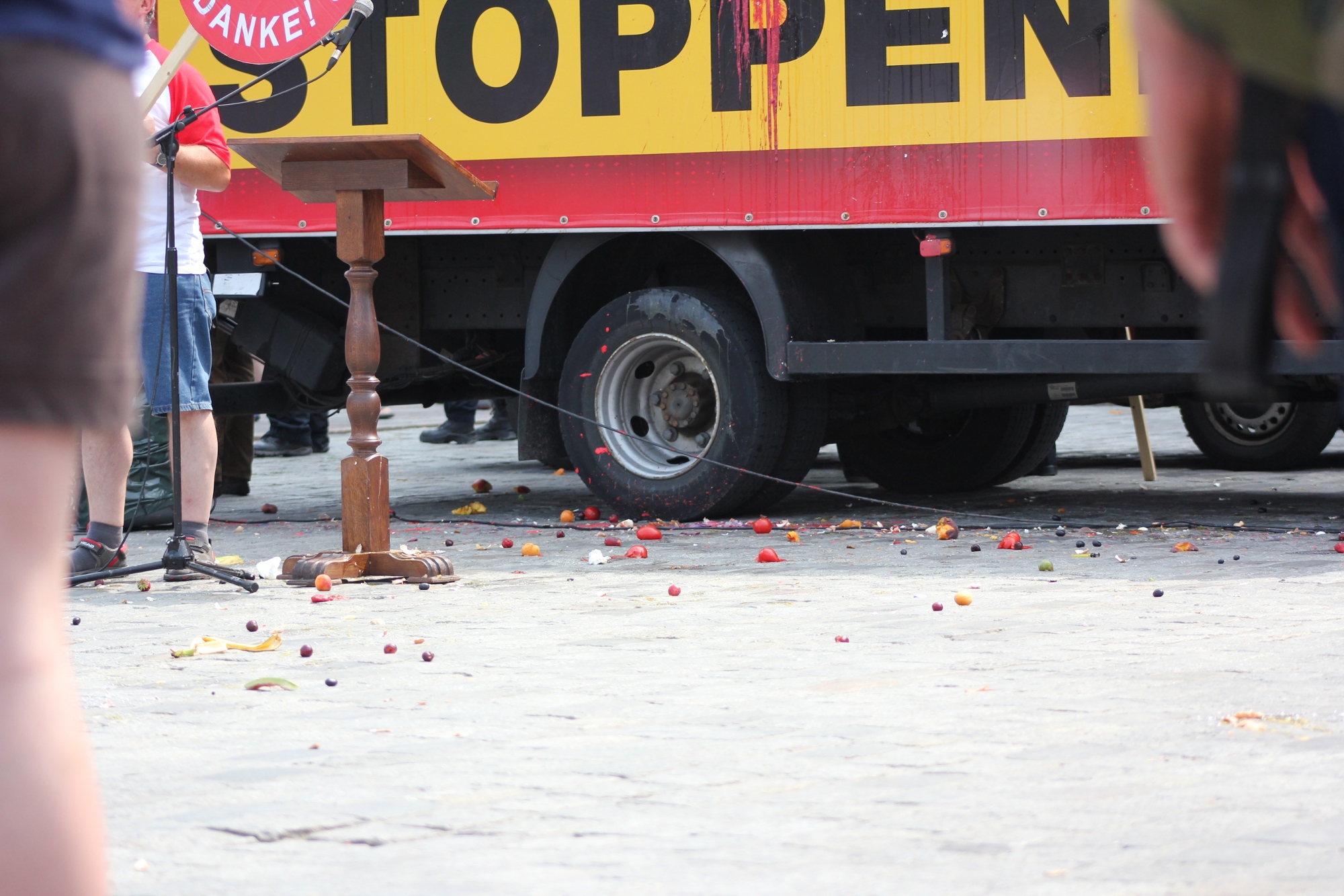Der Polizei, die zunächst nur mit wenigen Einsatzkräften, später aber mit einem massiven Aufgebot vor Ort war, gelang es nicht die Antifaschist_innen von der Kundgebung fernzuhalten. Binnen kürzester Zeit umringten wütende Menschen die NPD´ler und ihre Fahrzeuge. Trotz strahlenden Sonnenscheis mussten die verärgerten Neonazis dann auch noch die Schirme aufspannen, als ein Regen aus Eiern und Obst auf sie niederging. Dabei wurden angeblich zwei Neonazis verletzt. Solidarische Händler_innen verkauften ihre Waren zum Einkaufspreis an die Antifaschist_innen oder verschenkten sie gar. Udo Pastörs, ebenfalls von Eiern getroffen, verlor vollends die Fassung und ergoss sich in Selbstmitleid und Beleidigungen gegenüber den Antifaschist_innen.