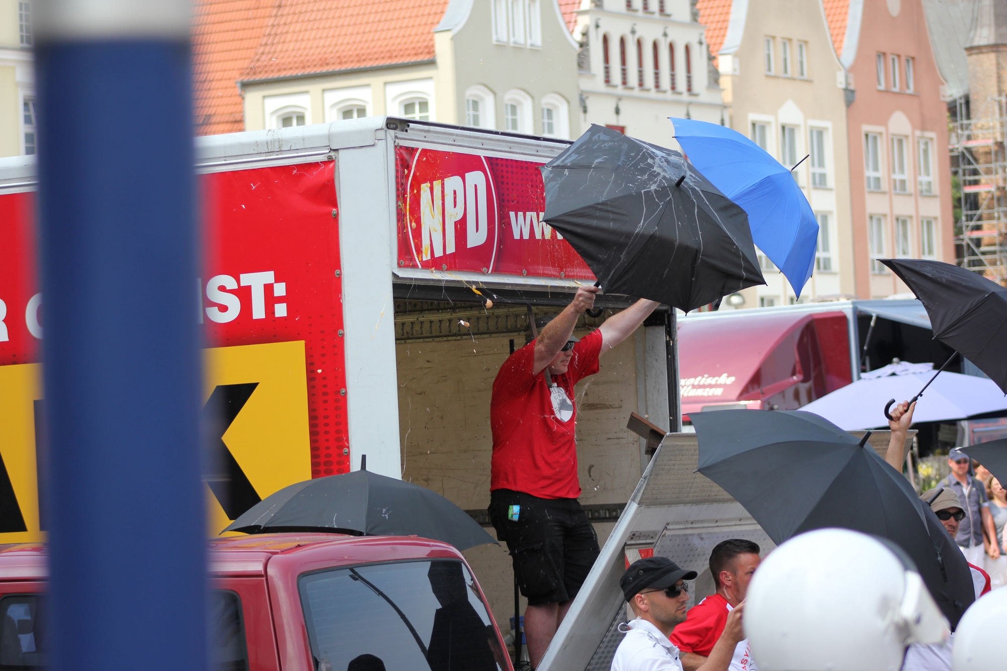 Gegenwärtig tourt die NPD im Rahmen des Bundestagswahlkampfes durch Mecklenburg-Vorpommerns Städte und hetzt gegen Asylbewerber_innen. Bisher fiel die Widerstand gegen die rassistische Propagandafahrt eher gering aus. Nachdem sich die NPD jedoch bereits am Mittwoch in Stralsund schon regen Protesten ausgesetzt sah, wurde ihr heutiger Tourstopp in Rostock gänzlich zum Debakel.