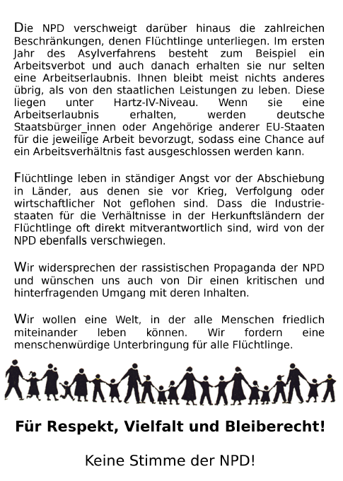 Seit Wochen zieren Wahlplakate mit volksverhetzenden Parolen die Straßen der Stadt, regelmäßig erreichten Flyer und Wahlzeitungen die Haushalte. Mit stumpfen Parolen, rassistischer Emotionalisierung komplexer Angelegenheiten wie des Asylrechts und verquerer Kapitalismuskritik versuchen die Neonazis auf Stimmenfang zu gehen. Um mit landläufigen “Argumenten” gegen Geflüchtete aufzuräumen, trafen sich am gestrigen Samstag, dem 21.09.2013, ca. 20 Antifaschist_innen in der Neubrandenburger Oststadt, um Flugblätter zu verteilen. Der Infoladen “…Stunk!” forderte dabei in einem Flugblatt, welches auf dem diesjährigen Alternativen Jugendcamp in Lärz formuliert wurde (2), ein Bleiberecht für alle Geflüchteten und klärte Vorurteile und Ressentiments gegen Flüchtlinge auf. Auch Flyer der antifaschistischen Kampagne “Wake up! Stand up!” (3), die sich gezielt mit Wahlkampfthemen der NPD auseinandersetzen, wurden in Briefkästen gesteckt und im persönlichen Gespräch an Passant_innen verteilt. Zudem wurde Nazipropaganda aus dem Stadtbild entfernt.