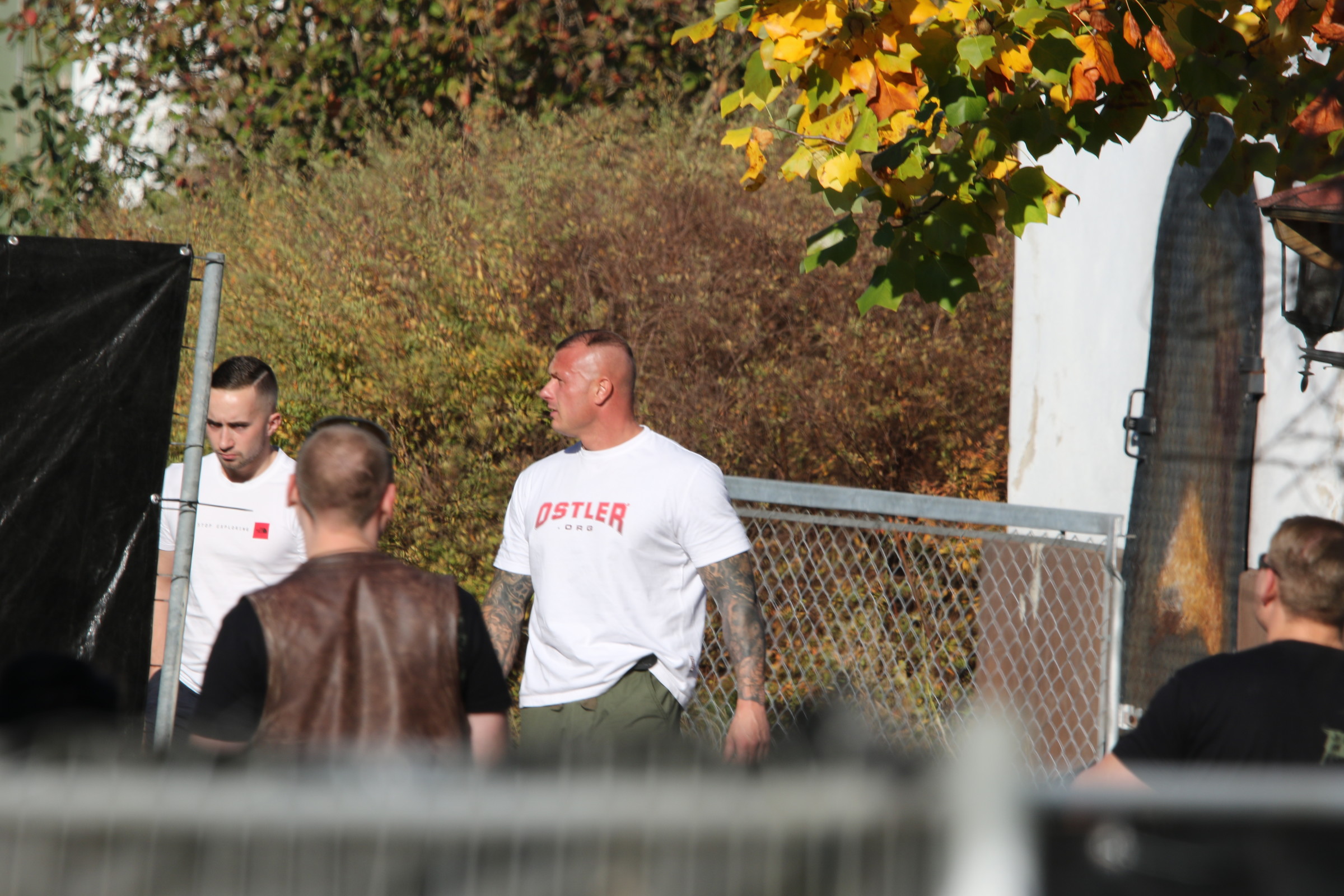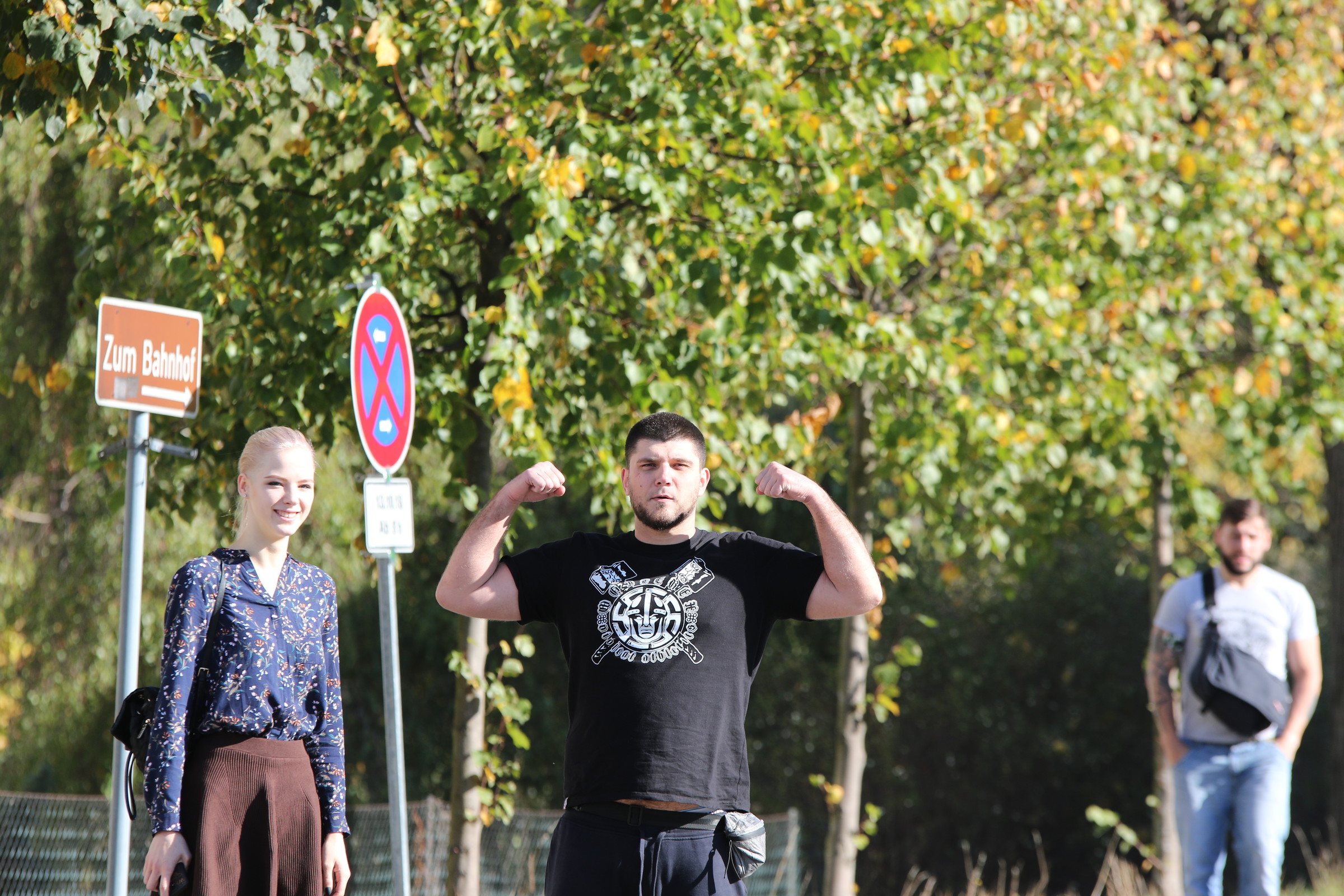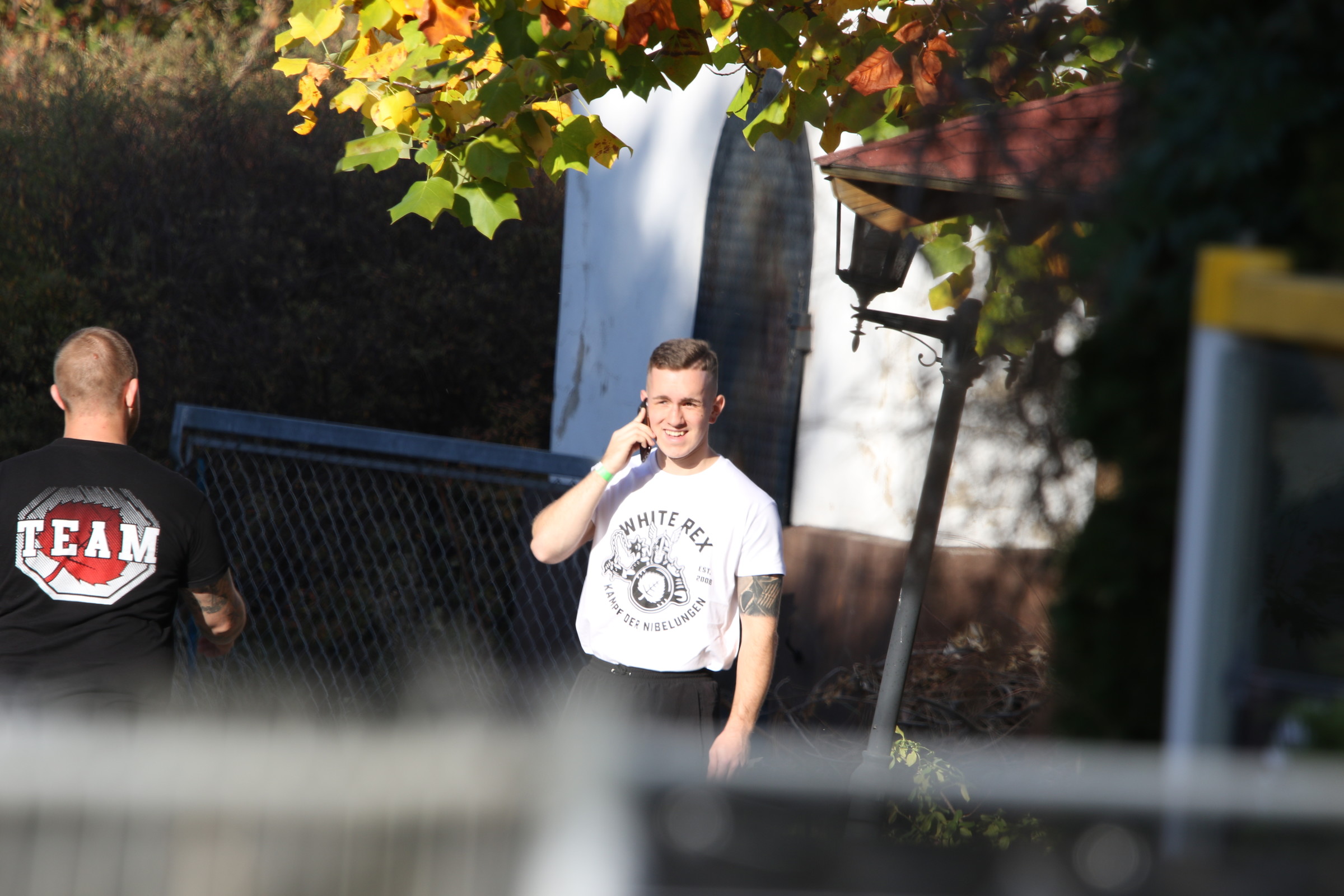 Wenn Medien über Neonazis im Kampfsport berichten, dann wir der fließend deutsch sprechende russische Neonazi, Hooligan und Gründer der Kampfsport-Promotion „White Rex“ Denis Nikitin oftmals als zentrale Figur genannt. Zu Recht, denn er gilt als Stichwortgeber für die wachsende extrem rechte Kampfsportszene. Seit 2008 reist der mittlerweile in Kiew wohnhafte Nikitin durch Europa und unterstützt alle relevanten rechten Turniere und Gruppen. Für den KdN gilt er als Hauptsponsor, sein Label „White Rex“ stand in diesem Jahr zum ersten Mal als Mitveranstalter des Turniers auf den Plakaten. Am 13. Oktober reiste Nikitin schon früh mit den zwei „Nummerngirls“ an. Sichtlich verärgert war er von den anwesenden Journalist_innen, die ohne dass er es beeinflussen konnte, Fotos von ihm schossen. Denn Nikitins täglich Brot ist nicht nur die Vermarktung von „White Rex“, sondern auch die Selbstinszenierung. Dabei bestimmte er bisher nur allein, welchen Formaten er Interviews gab und wer ihn fotografieren durfte. Journalist_innen widmen sich seiner Person teilweise mit seitenlangen Portraits. In Ostritz wirkte er auf die anwesenden Berichterstatter_innen während seiner Anreise zunächst aggressiv, ließ sich jedoch kurz darauf auf selbstdarstellerische Posen ein.