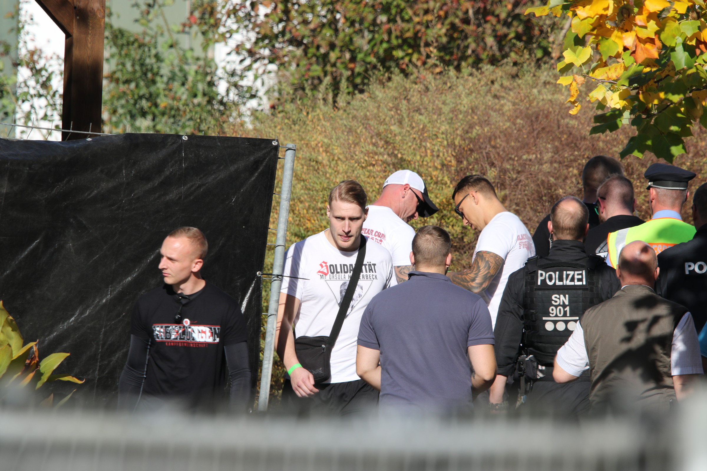 An exponierter Stelle als Ordner eingesetzt, war auch Robin Schmiemann aus Dortmund als Teil der Orga erkenntlich. Er gehört der Führungsriege des deutschen Ablegers der rechts-terroristischen Gruppe „Combat 18“ an. Die Verbindung von Schmiemann zum KdN könnte zum einen über seinen Vertrauten, den extrem rechten Dortmunder Kampfsportler Kevin Kruck, entstanden sein, der im Rahmen der Turniere des KdN schon als Punkterichter involviert war und das als Abgesandter des KdN-Teams u.a. 2017 auf dem „Force & Honneur“ in Frankreich anwesend war. Zum anderen ist Schmiemann auch selbst Hobby-Kampfsportler und gilt zudem als enger Wegbegleiter von Thorsten Heise, u.a. NPD-Führungsperson, „Combat 18“-Unterstützer und Hauptorganisator des „Schild & Schwert“-Festivals in Ostritz. Heises politischer Ziehsohn Gianluca Bruno war schließlich auch in den reibungslosen Ablauf des KdN-Turnier am 13. Oktober 2018. So war er an den Kooperationsgesprächen mit der Polizei am Tag selbst beteiligt und begleitete Deptolla auf dem polizeilichen Rundgang über das Gelände des Hotel „Neisseblick“.