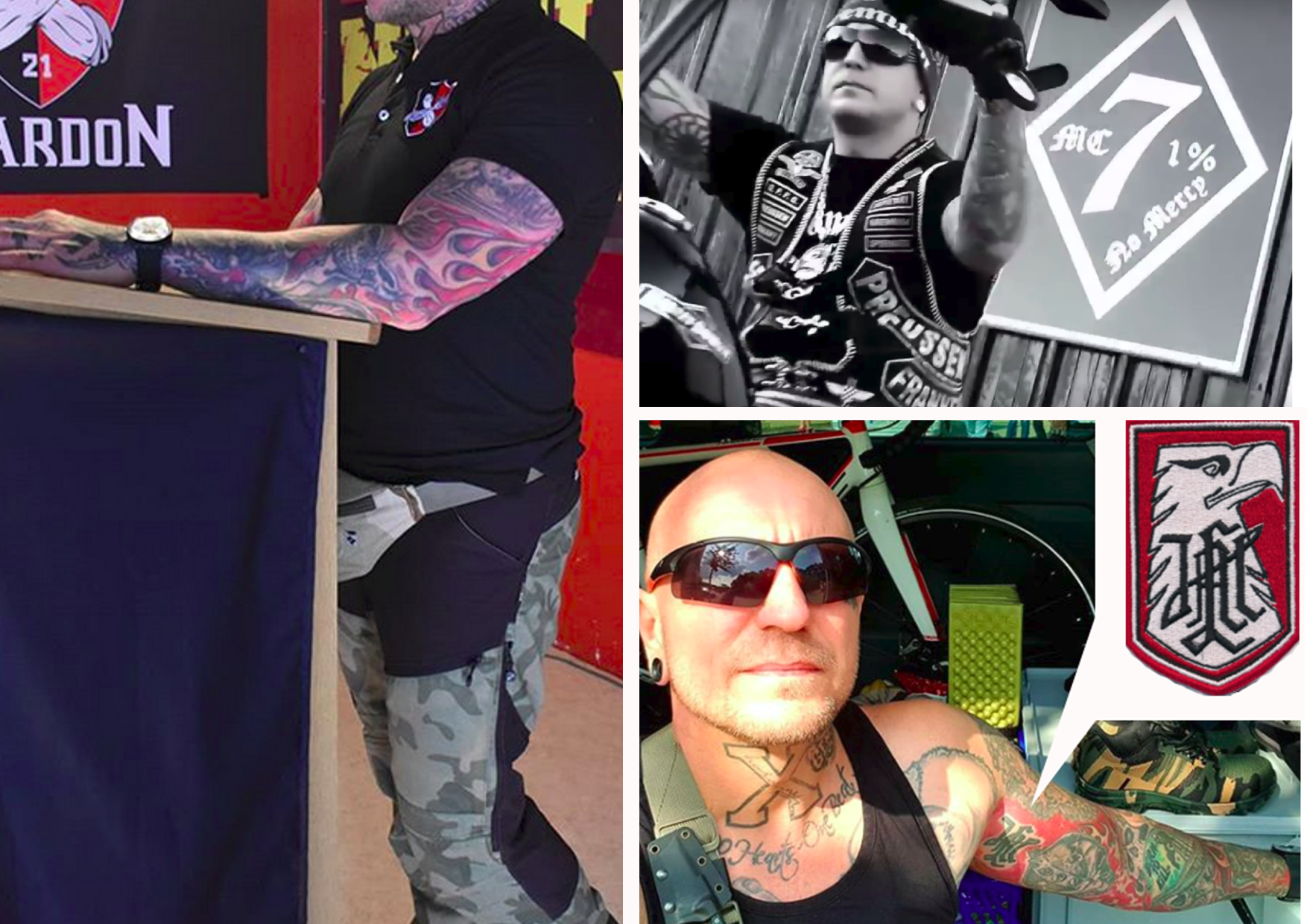Heiko Drews als Redner beim ersten „Heureka-Kongress“ 2018. Oben rechts zu erkennen als „Secretary“ des Spremberger Ablegers des „Gremium MC“; Unten rechts: Drews mit tätowiertem Emblem der „Leibstandarte Adolf Hitler – LAH“ (Quelle: Screenshots Facebook)