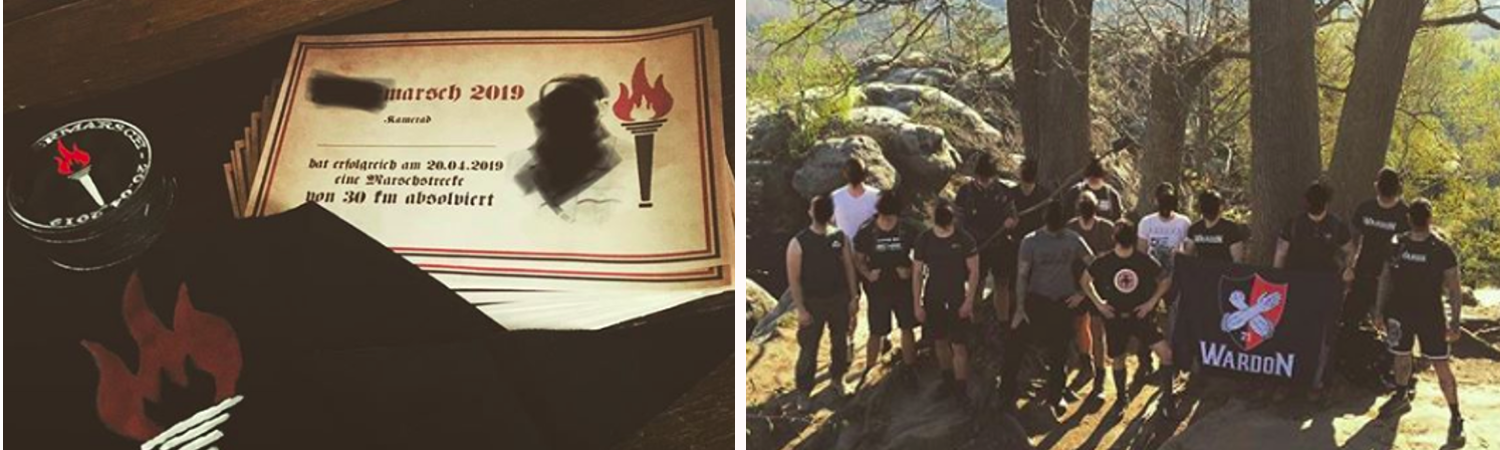 So führte W21, darunter u.a. Philipp Liebetrau, Heiko Drews und Jörg Henning, gemeinsam mit Aktivisten der „Jungen Nationalisten“ aus Ostsachsen am 20. April 2019 einen „March der 18 Treu’n“ in der sächsischen Schweiz durch. Nicht zufällig war dieses Datum gewählt, denn niemanden anderes als Adolf Hitler wollten die wandernden Neonazis an seinem 130. Geburtstag ehren. „Hitlermarsch“ stand auch auf den Urkunden der Teilnehmenden.