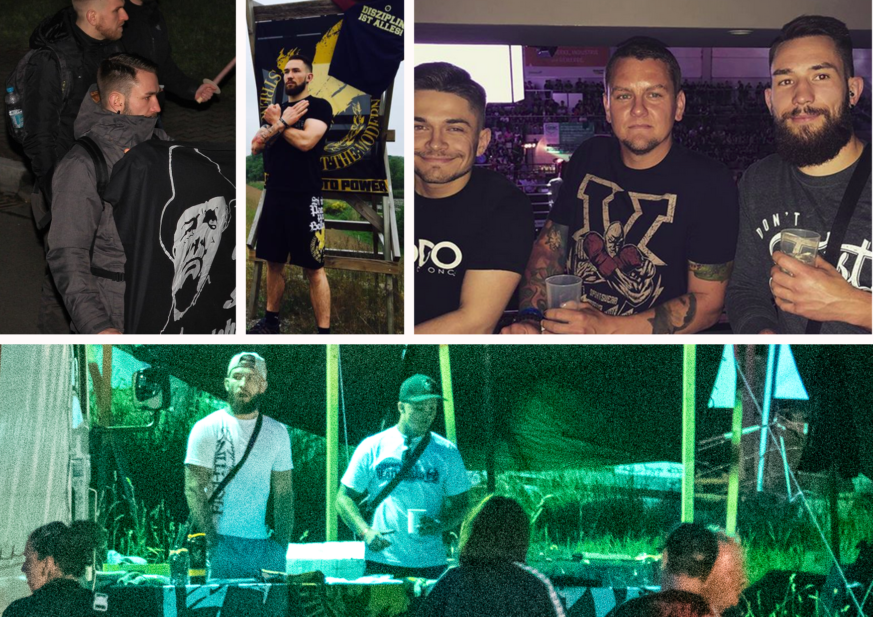 Unten: Philipp Oertel (links) als Standbetreuer von „Greifvogel Wear“ im Sommer 2018 in Themar (Quelle: Witzgall), oben rechts mit Stefan Wedekind (Mitte) und seinem Bruder Lukas Oertel (1.v.l.) bei der „La Familia“-Fightnight in Halle im April 2018