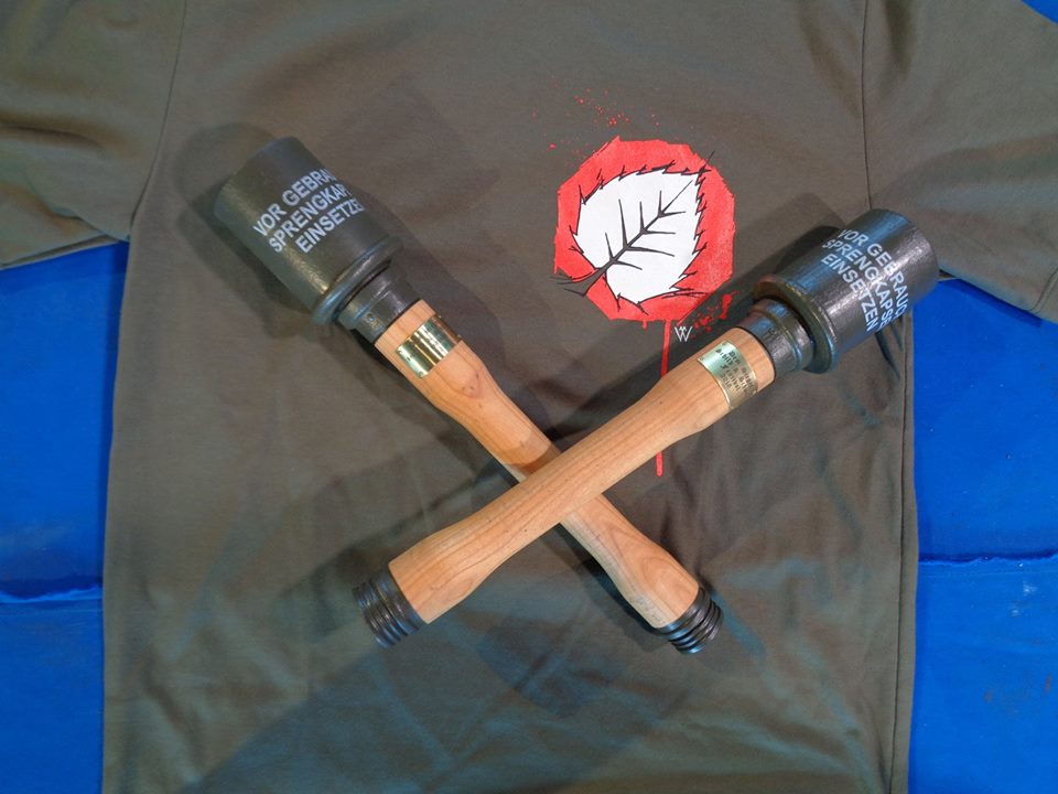 Die „Pokale“ des „Kampf der Nibelungen“ in Ostritz: Stilhandgranaten mit Plakette (Bild: Screenshot Facebook)
